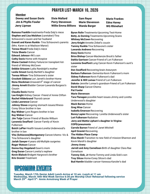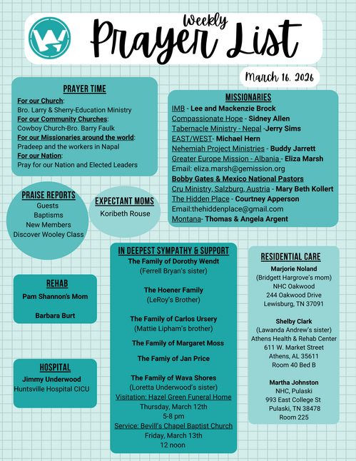 We need men to sign up to assist with John Rice and his weekly exercise schedule. If you are interested, contact Natalie Gottman at 256-431-5075.